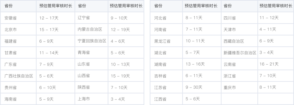 各個省管局預(yù)計審核時長,實際審核時長會根據(jù)備案場景有所不同,下表格僅供參考。詳情可查看 詳細(xì)規(guī)則。